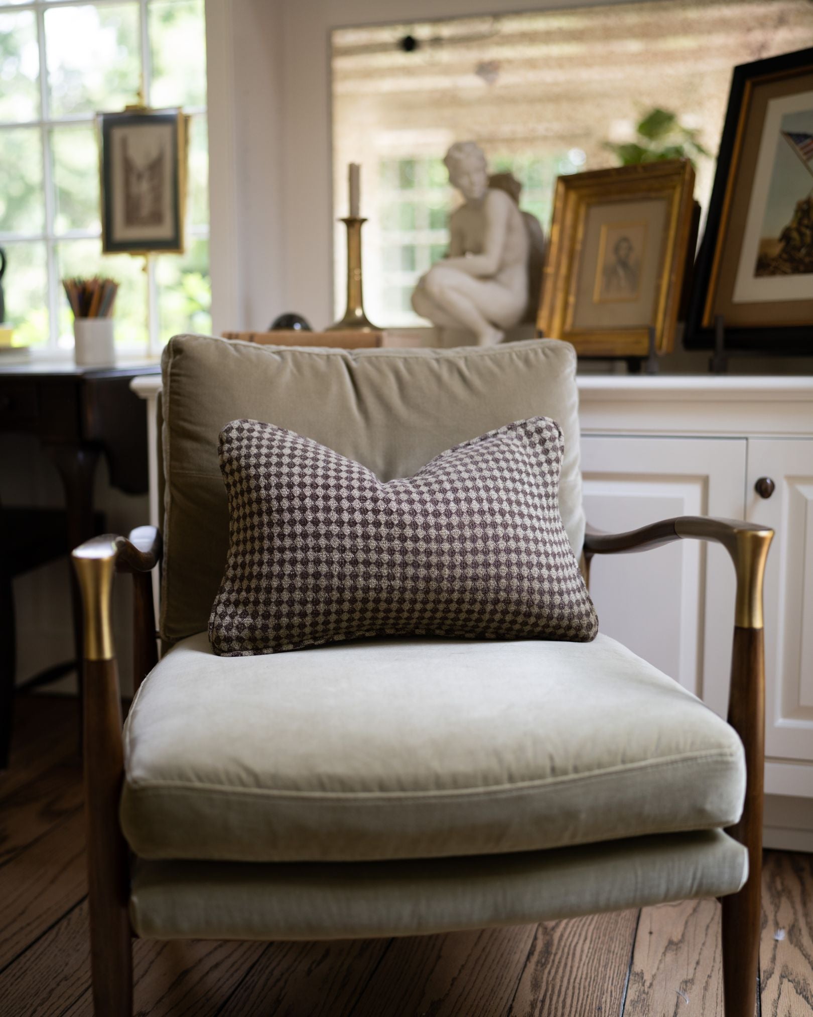 The Mercer Pillow showcases a small-scale check pattern in deep espresso and soft beige, offering a refined nod to classic menswear textiles. Its tailored lumbar shape is perfect for grounding layered pillow arrangements or adding support to a statement chair. Versatile and elevated, the Mercer brings a touch of pattern and polish to any room.