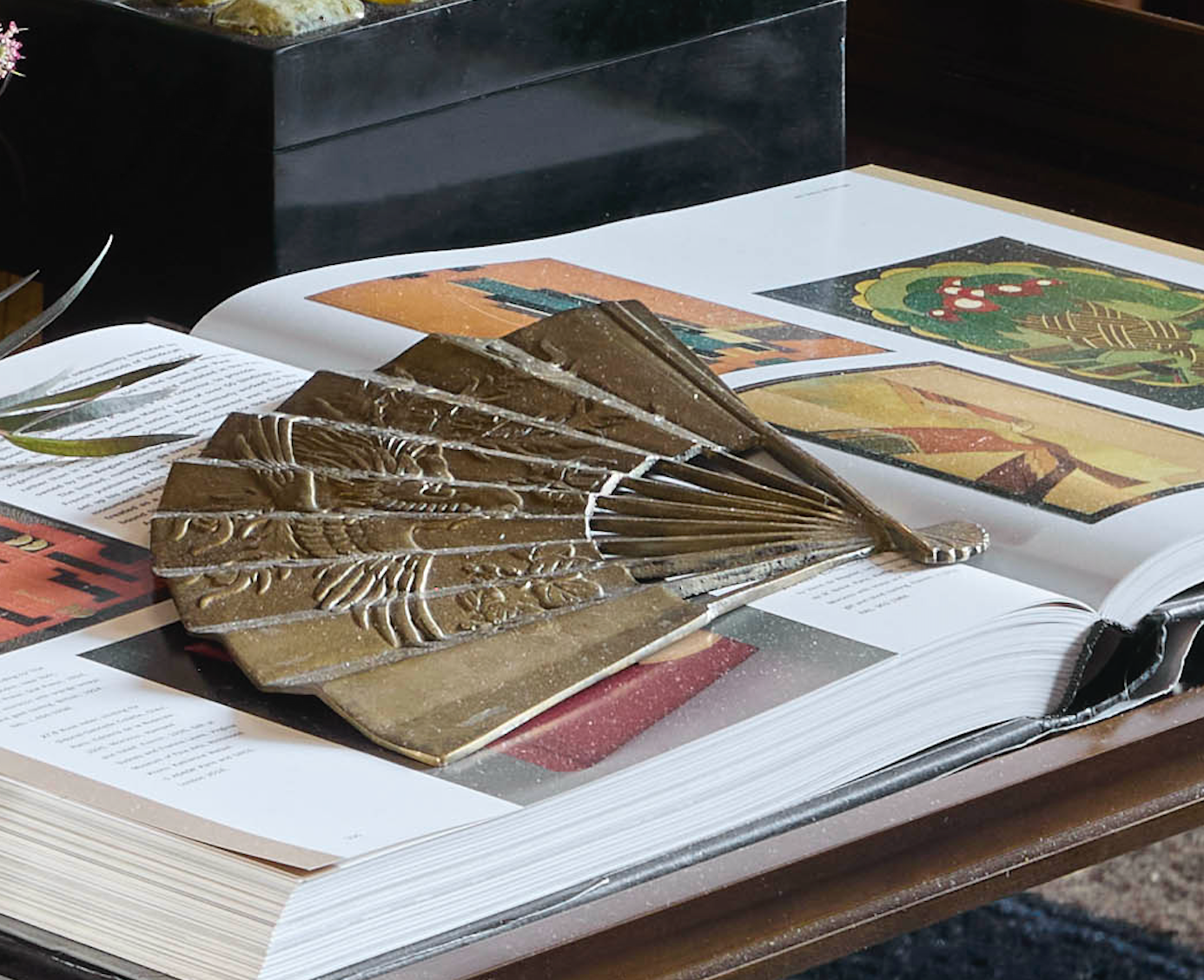 A striking nod to timeless craftsmanship, this vintage brass book weight takes the elegant form of a folding fan — each rib intricately embossed with birds and floral motifs that recall early 20th-century artistry. Its sculptural silhouette adds a touch of old-world charm while serving a practical purpose: keeping the pages of your favorite design tomes and art books perfectly in place. Substantial in hand and beautifully patinated, this piece brings both function and refinement to a coffee table or writing desk.